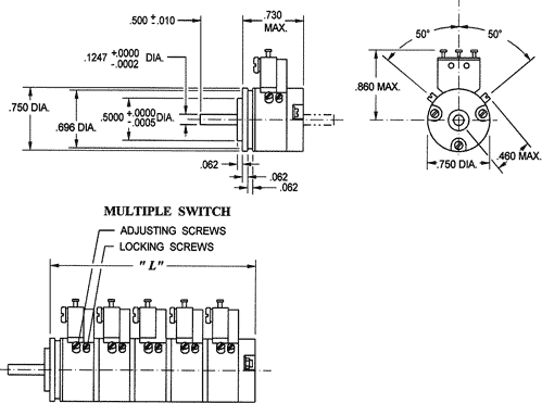 Model CS 601 Adjustable Cam Switches incorporate standard type SPDT sub-miniature snap switches and are available as single switch units or in ganged assemblies with as many as eight independently-adjustable switches. Both single- and multi-switch types can be supplied with optional shaft extensions or double-ended shafts. All models meet the applicable requirements of Ml L-E-5400.
